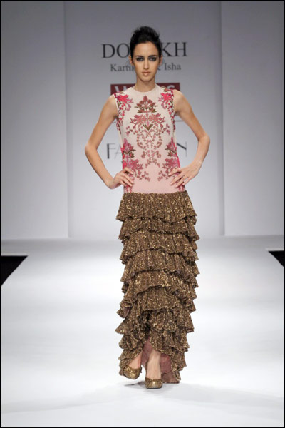 The silhouette integrates the romanticism of the pre-Raphaelite period where art was at its finest, but the glory was short lived. Intricately designed free flowing chiffons are broken by complex rushing, gathering and pin tucks. Ombre shades give way to strong shadow work hiding beneath the wistful folds of sheer fabric. Temperamental reds and grey’s, quixotic off-whites, soft pale pinks, blood reds and shades of navy comes together in an effort to lay an extensive framework of a beautiful mind.